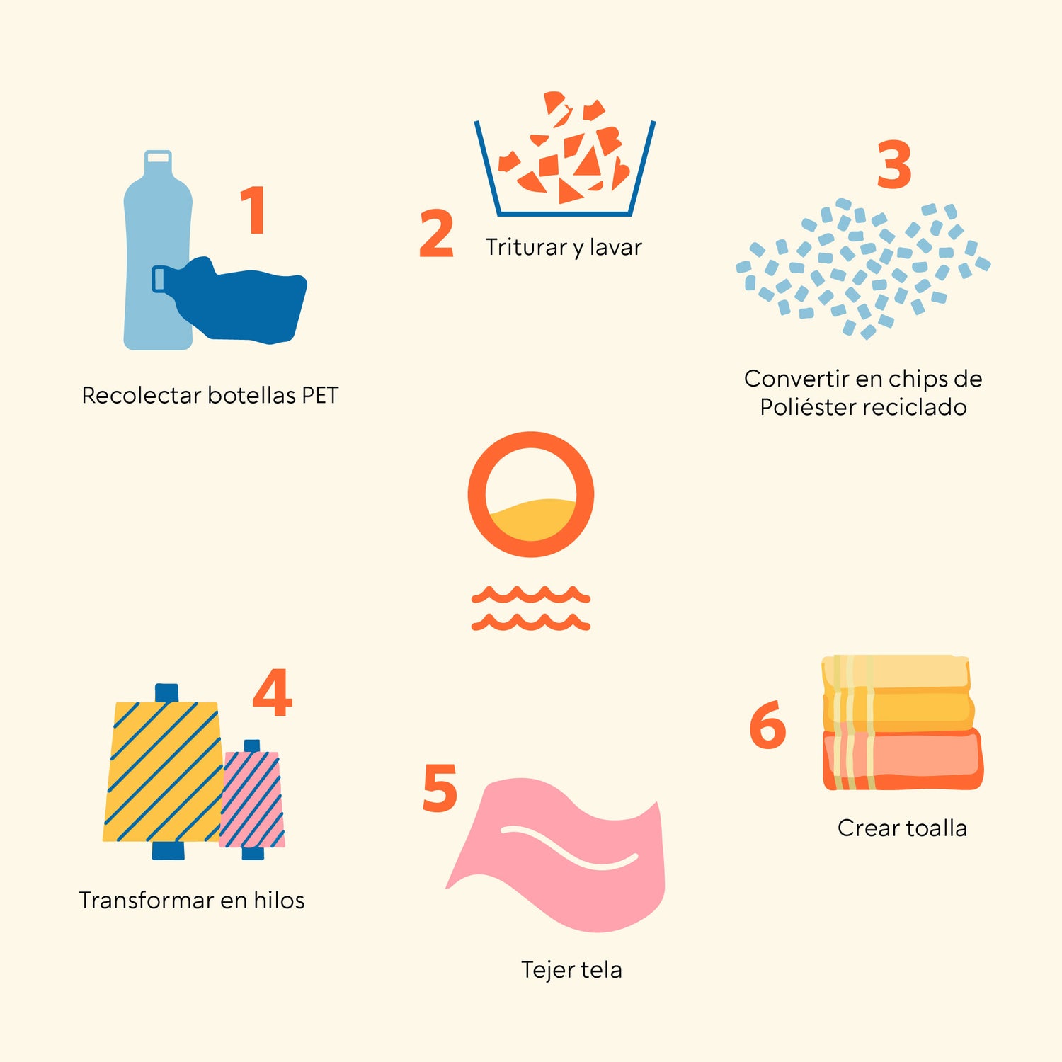 Nuestras toallas están hechas con un 85% de material reciclado a partir de botellas de plástico y tienen las mismas cualidades que la microfibra estándar.