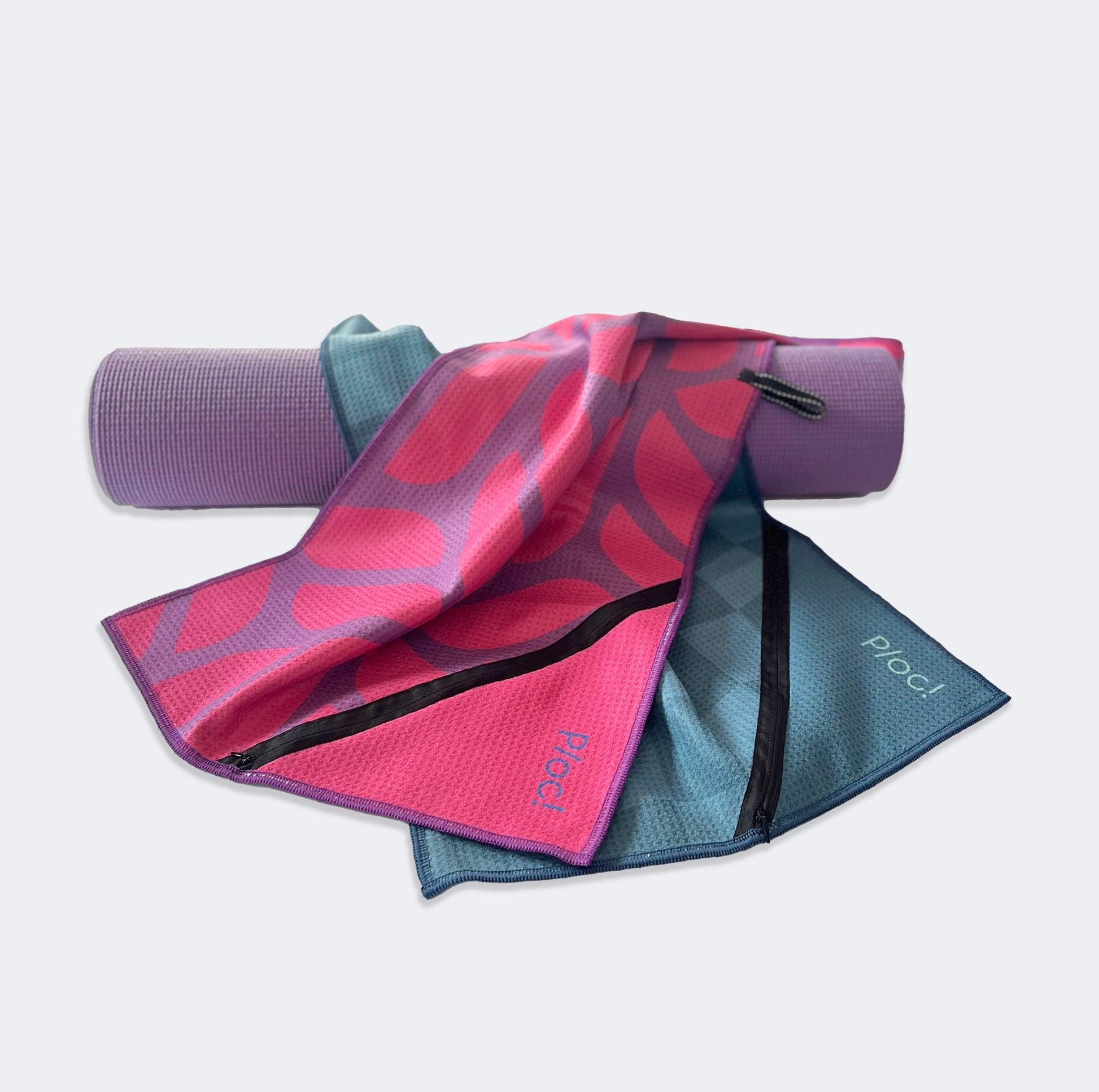 Toallas de microfibra reciclada waffle, con bolsillo para guardar llaves o celular y un loop para colgar.